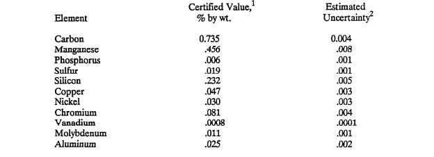 2 为一个成分列出的估计不确定度是基于判断的,代表了方法精度、方法间可能的静态误差和材料变化的综合评价。由于大多数成分的测定涉及几种方法,因此没有试图得出精确的统计度量。