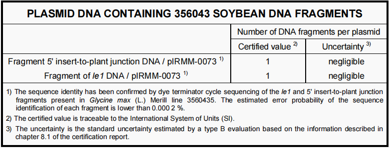 ERM-AD425 356043大豆质粒DNA片段标准品由含有质粒的DNA溶液组成,质粒中插入了356043 5‘插入植株连接的99碱基对(bp)片段以及大豆内源性凝集素基因(le1)的259bp片段。该溶液由1 mmol/L TRIS,0.01 mmol/L EDTA pH 7.0组成,并添加1ng/μL的ColE1质粒DNA。每个试管中含有大约500μL的质粒溶液。根据委员会条例(EC)第65/2004号,356043事件被分配了唯1标识码DP-356Ø43-5。