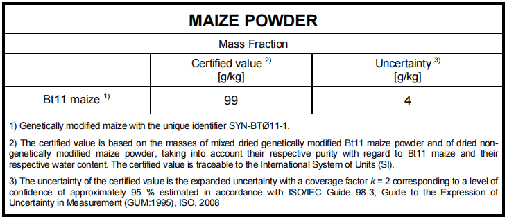 ERM-BF412ek Bt11 玉米标准品是5种Bt11玉米粉认证参考物质(CRMs)之一,含有不同质量分数。ERM-BF412ek由非转基因玉米和转基因Bt11玉米的全种子生产,均由先正达作物保护有限责任公司(北卡罗来纳州,美国)提供。根据先正达作物保护有限责任公司提供的信息,用于制备ERM-BF412的转基因玉米种子为半合子,Bt11玉米事件的供体为雄亲本。根据委员会法规(EC)第65/2004号,唯1标识码SYN-BTØ11-1被分配给Bt11玉米事件。CRM供应在琥珀色玻璃瓶中,包含至少1克玉米氩气粉末。