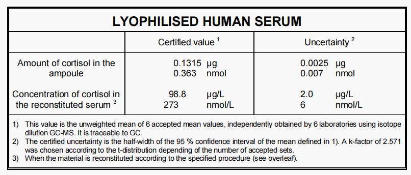 ERM-DA192 人体血清(皮质醇未加标)标准品每个样品都是1.25 mL部分血清的冻干形式,不添加添加剂。安瓿中所含的冻干物质的质量约为0.1g。材料在密封玻璃安瓿中保存氮气。样品的水质量分数低于0.005g/g。