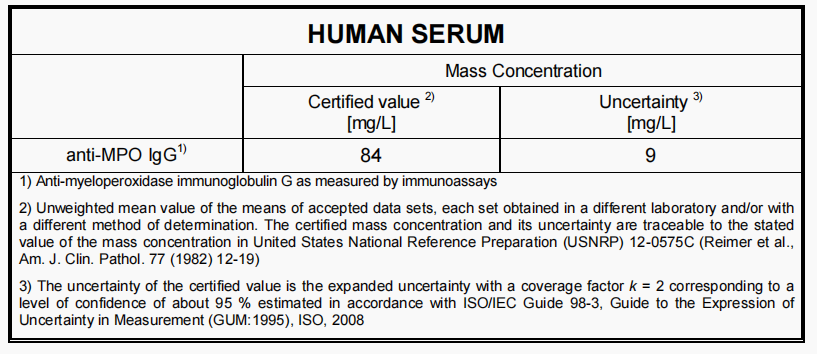 ERM-DA476_IFCC 人血清中IgG 抗MPO标准品是1.0 mL部分血清的冻干形式,含有添加剂(4-(2-羟.乙基)-1-哌.嗪乙磺酸(HEPES)、叠氮.化钠、一水盐酸苯扎胺、氯化钠和抑肽.酶)。材料保存在带有橡胶塞和聚丙烯螺帽的螺纹玻璃瓶中。冻干粉必须用(1.00±0.01)g的蒸馏水重新配制