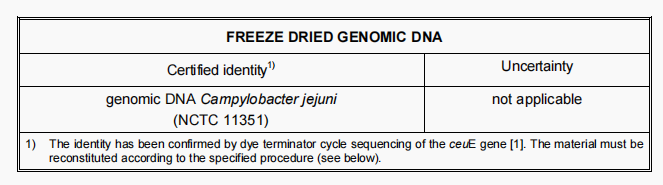 IRMM-448 空肠弯曲杆菌基因组 DNA标准品每个小瓶(0.5 mL)含有约71 ng空肠弯曲杆菌(NCTC 11351)冻干基因组DNA(gDNA),已在氩气气氛下关闭。