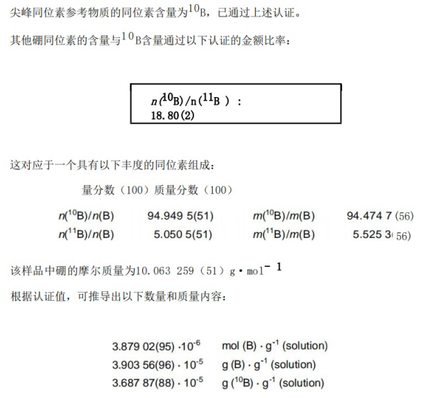 所有表示的不确定度均为扩展不确定度U=k·uc,其中uc是根据ISO/BIPM测量不确定度表达式指南估计的组合标准不确定度。它们在括号中给出,并包括一个覆盖因子k=2。它们适用于该值的最后两位数字。被认证的值可以追溯到SI。