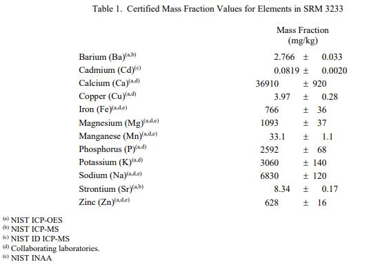 表 1 和表 2 提供了 SRM 3233 中元素和维生素的认证质量分数值,以干质量为基础报告。NIST 认证值是 NIST 对其准确性有最高置信度的值因为所有已知或可疑的偏见来源都已被调查或考虑 [1]。价值分配分析由 NIST 和合作实验室进行。认证值计算为 NIST 方法的平均值、美国农业部 (USDA) 方法的平均值以及合作实验室提供的平均结果的中位数(如果适用)。所有值在没有加权的情况下合并。相关的不确定性以 95% 的置信水平表示 [2-4]。