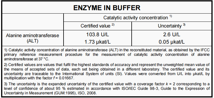 ERM-AD454k_IFCC 丙氨酸转氨酶的主要目的是控制IFCC主要参考测量程序的性能,用于在37°C下ALT催化活性浓度的测量。当该材料在常规测量程序中被用作校准剂时,应验证有关分析的可交换性。为制备ERM-AD454k/IFCC,冻干材料: